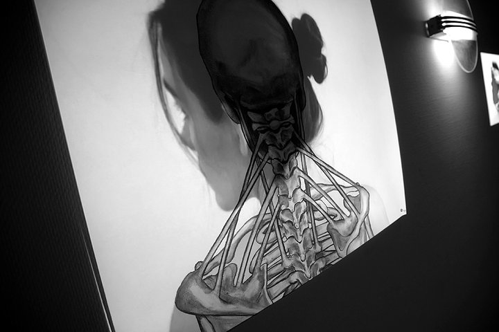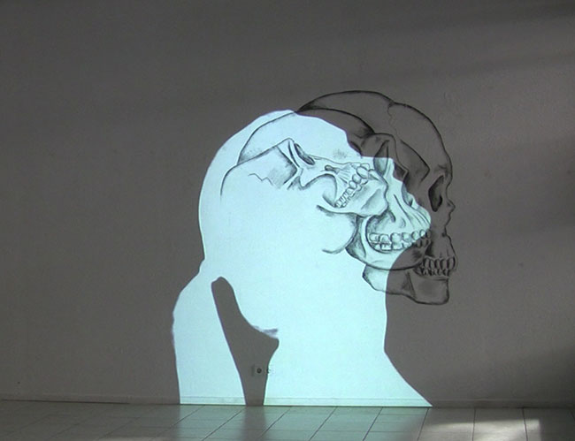 Video installations, oil paintings and drawings. In the video projections the person tries to fit in, looking for the differences but also looking for the similarities.