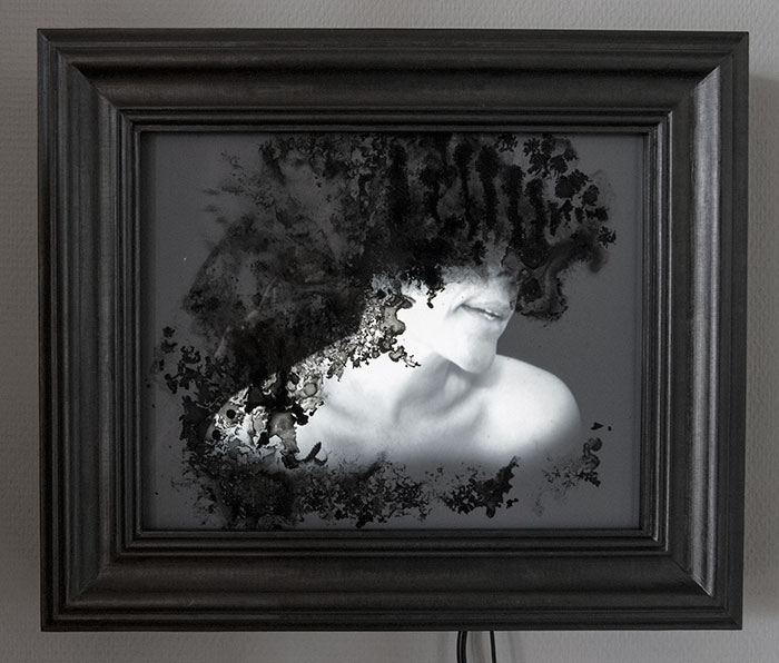 Study of the psychological interpretation of inkblots from the serie Lost identity. Video, HD, loop 0'20" Pvc foil, india ink Computer-screen, glass,lead, 31 x 37 2017
