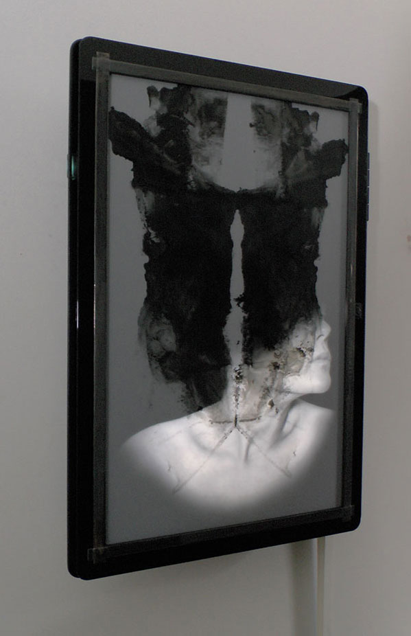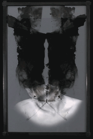 Study of the psychological interpretation of inkblots from the serie Lost identity. Video, HD, loop 0'56" Pvc foil, india ink Computer-screen, glass, lead, 53 x 35 2017