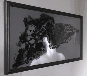 Study of the psychological interpretation of inkblots from the serie Lost identity. Video, HD, loop 0'18" Pvc foil, india ink Tv-screen, glass, frame, 65 x 110 2018