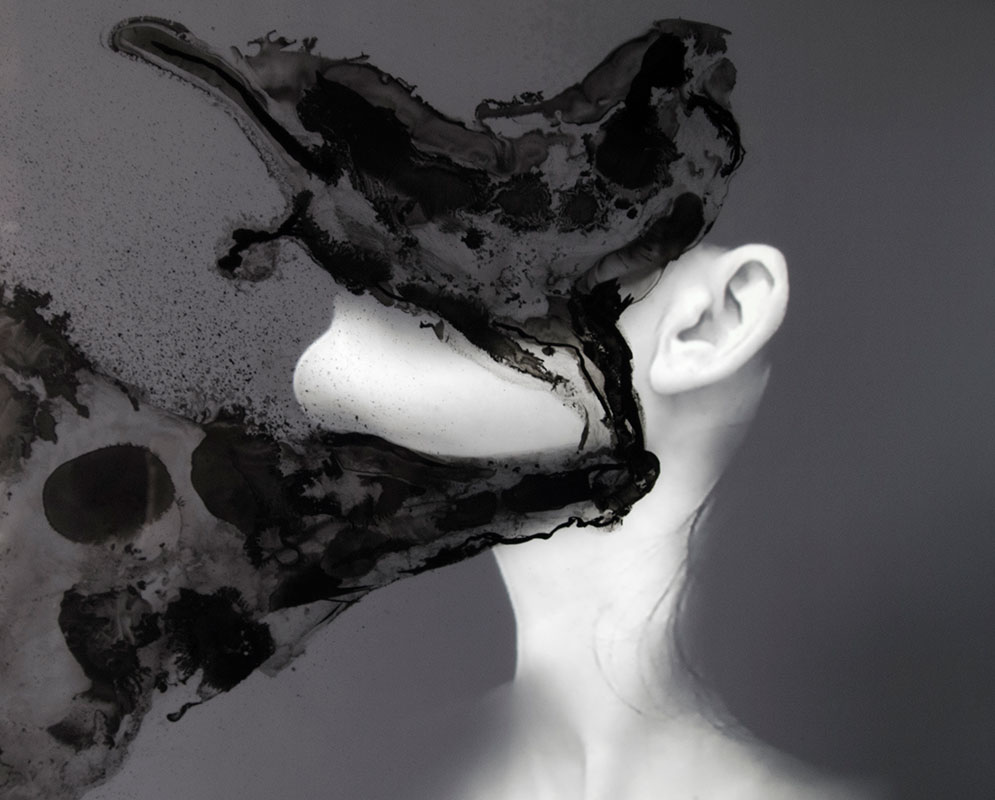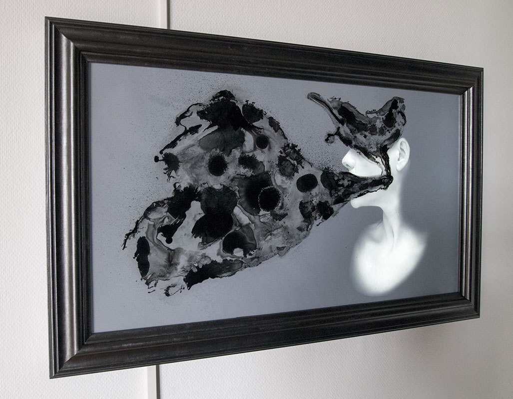 Study of the psychological interpretation of inkblots from the serie Lost identity. Video, HD, loop 0'24" Pvc foil, india ink Tv-screen, glass, frame, 95 x 59 2019