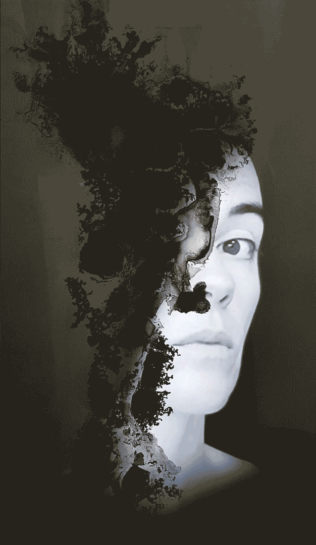 Study of the psychological interpretation of inkblots from the serie Lost identity. Video, HD, loop 0'15" Pvc foil, india ink Tv-screen, glass, frame, 78 x 48 2019