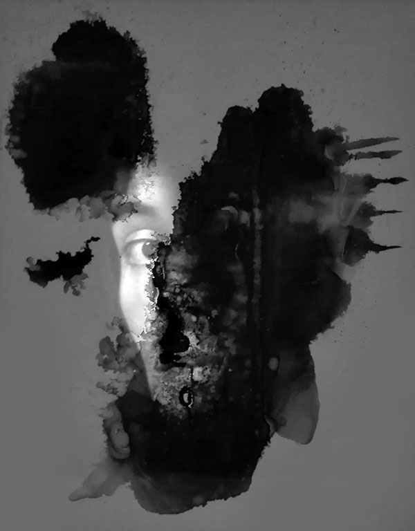 Study of the psychological interpretation of inkblots from the serie Lost identity. Video, HD, loop 0'14" Pvc foil, india ink Computer-screen, glass, frame, 40 x 34 2017