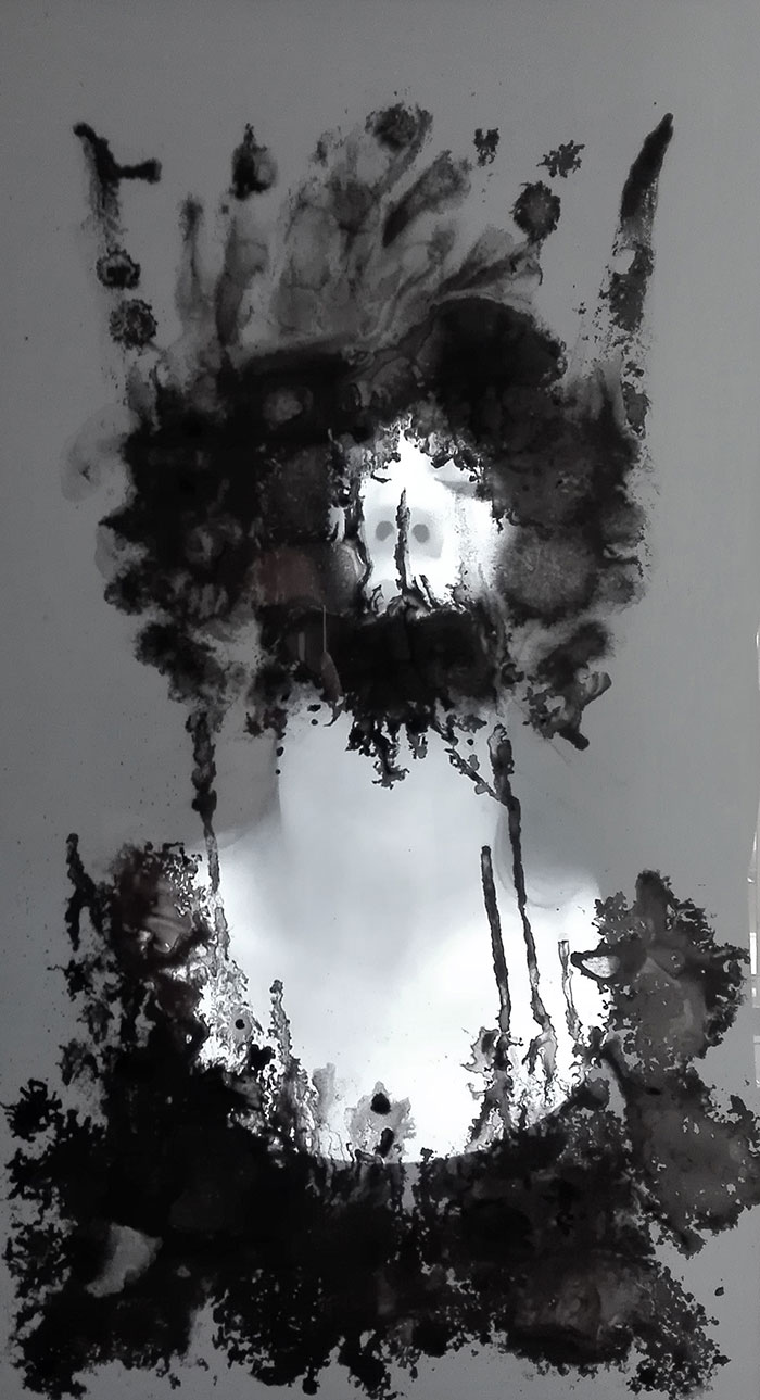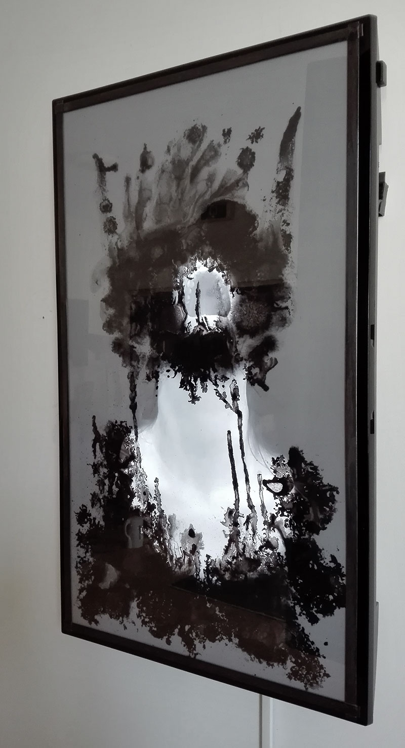 Study of the psychological interpretation of inkblots from the serie Lost identity. Video, HD, loop 0'44" Pvc foil, india ink Tv-screen, glass, lead, 76 x 46 2017