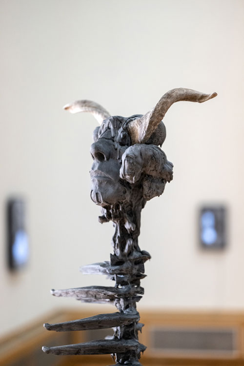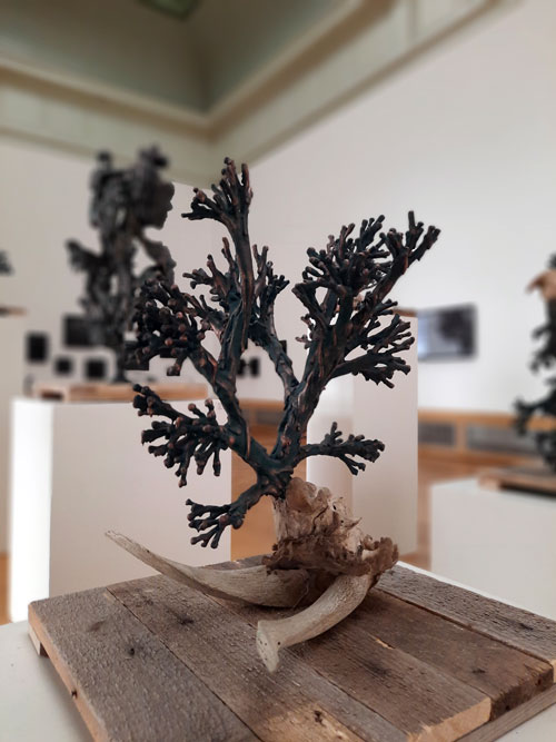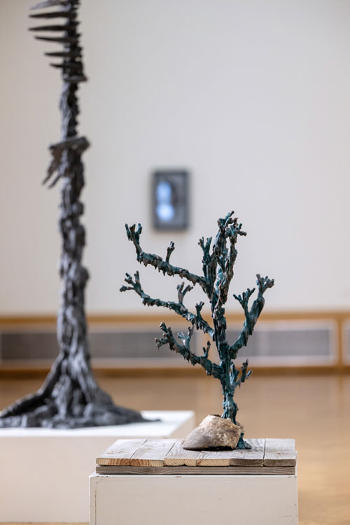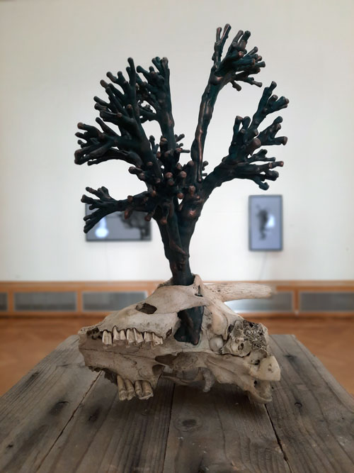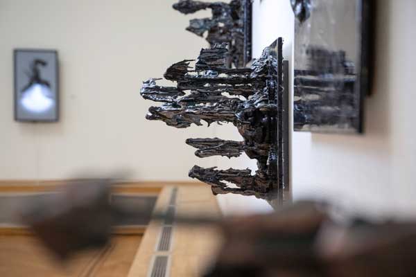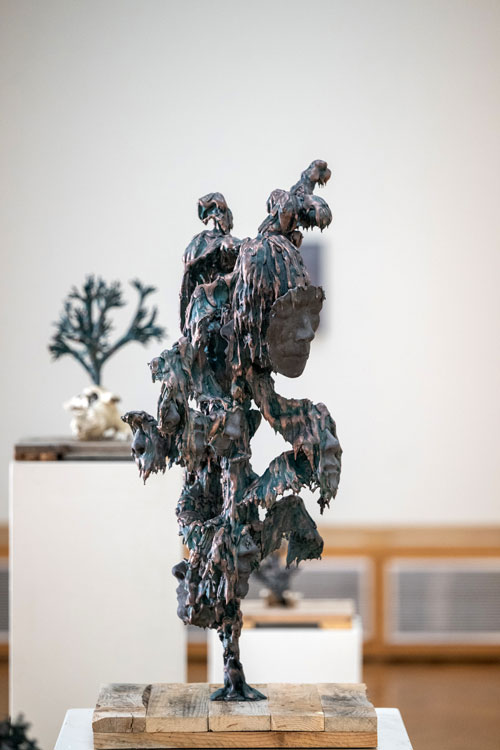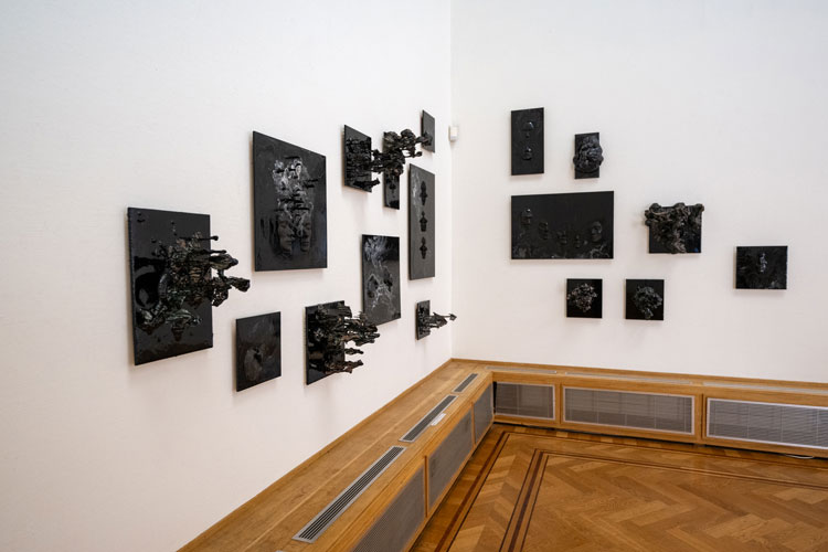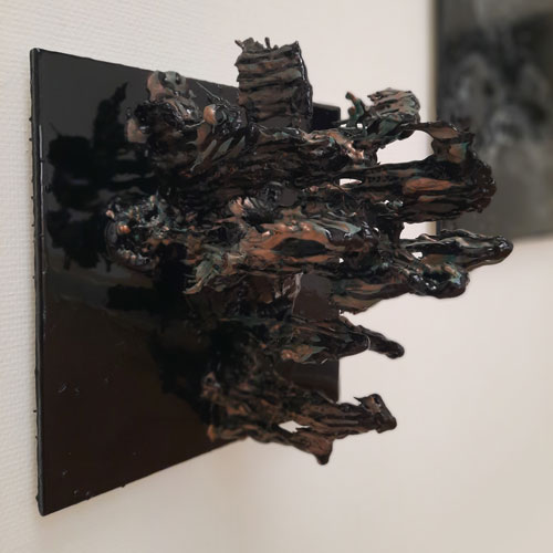 At times, the sculptures appear covered by a dark, oily skin, from which something living seems to struggle to surface. The textures evoke a tension between growth and decay, between what is visible and what remains hidden. Patterns reminiscent of fungi or neural networks suggest mental processes — as if thoughts themselves have solidified into matter.