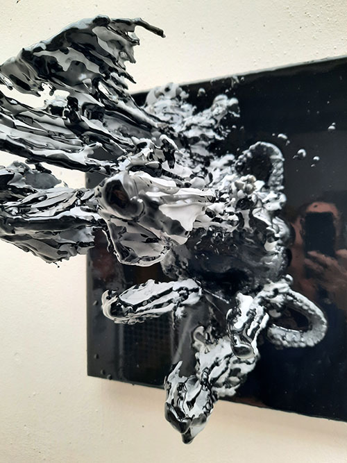 Fossil Fuels from the serie Oil spills. Reliëf acrylic medium, cast on wood 35 x 35 2024